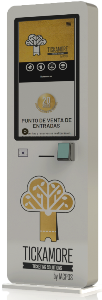 Diseño moderno. Venta y cobro en tarjeta y efectivo. Impresión de billetes y pulseras. Difusión de información turística en pantalla.